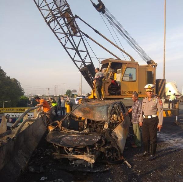 JAKARTA, iNews.id – Kepolisian mengevakuasi kendaraan minibus dan truk milik Pertamina yang terbakar dini hari tadi di Kilometer 05 Tol Rawamangun arah Cawang, Jakarta Timur. Traffic Management Center (TMC) Polda Metro Jaya lewat akun media sosial Twitter menunjukkan, proses evakuasi tersebut menggunakan satu unit crane.