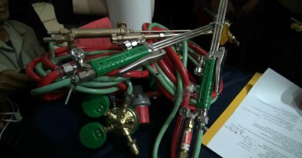 Salah satu barang bukti yang disita polisi dari tangan para pelaku parampokan minimarket di Jakarta Timur. Alat las ini digunakan pelaku untuk membobol gerbang dan brankas toko. (Foto: iNews/Rio Manik)