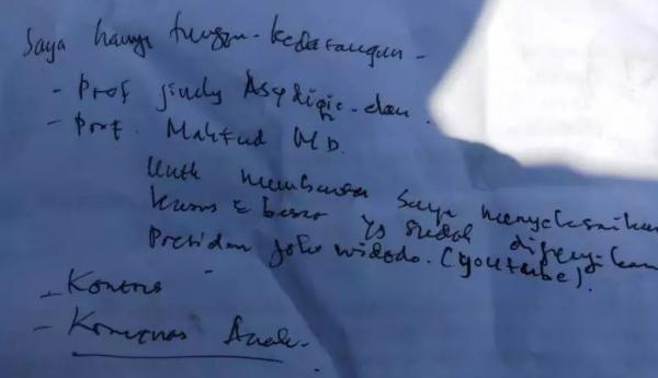 "Saya hanya tunggu kedatangan Prof Jimly Asshiddiqie dan Prof Mahfud MD untuk membawa saya menyelesaikan kasus besar yang sudah dijanjikan Presiden Joko Widodo (youtube)," demikian isi surat tersebut.