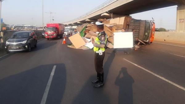 Truk Bermuatan Karton Terguling di KM 1.600 A Cawang Arah Jatibening, Lalu Lintas Padat