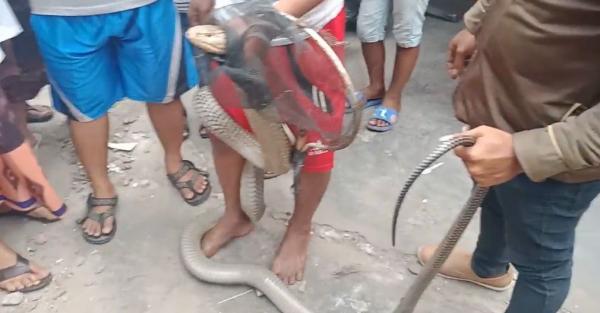 Ular king kobra berhasil ditangkap beramai-ramai saat bersembunyi di bebatuan belakang rumah warga setempat. Warga memperkirakan hewan reptil itu memiliki berat 10 kilogram.