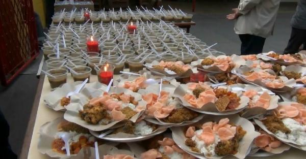 Dengan penuh antusias, puluhan hingga seratusan warga Buddha mempersiapkan makanan untuk berbuka di pelataran kelenteng yang berlokasi di kawasan Petak Sembilan, Jalan Kemenangan Taman Sari, Jakarta Barat, Sabtu (26/5/2018). Hidangan yang mereka sajikan itu terdiri atas berbagai macam menu takjil, termasuk nasi dan lauk pauk.