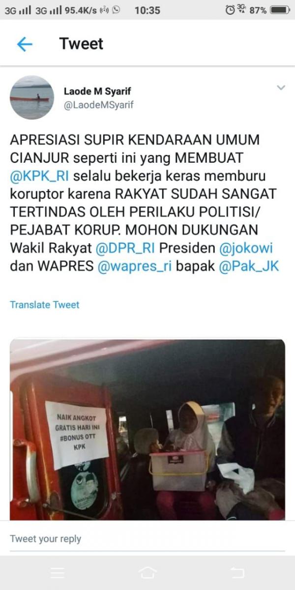 “Apresiasi sopir kendaraan umum Cianjur seperti ini yang membuat KPK RI selalu bekerja keras memburu koruptor karena rakyat sudah sangat tertindas oleh perilaku politisi atau pejabat korup,” tulis Laode pada akun media sosial Twitter-nya, Kamis (13/12/2018).