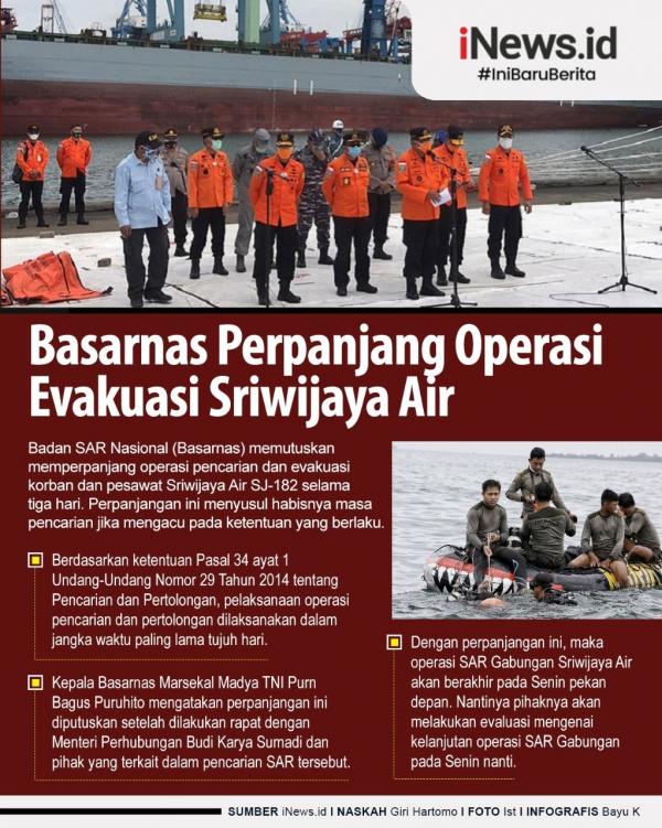 JAKARTA, iNews.id - Badan SAR Nasional (Basarnas) memutuskan memperpanjang operasi pencarian dan evakuasi korban dan pesawat Sriwijaya Air SJ-182 selama tiga hari. Perpanjangan ini menyusul habisnya masa pencarian jika mengacu pada ketentuan yang berlaku.
