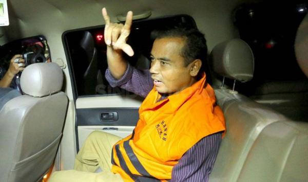 Bupati Tasdi menunjukkan salam metal saat ditahan KPK. (Foto: SINDOnews)