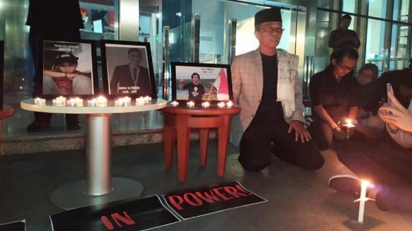 Aksi keprihatinan digelar Koalisi Masyarakat Sipil Antikorupsi di lobi gedung Merah Putih. Suasana lobi itu terlihat gelap. Lampu dipadamkan. Setelahnya, lilin-lilin dinyalakan.
