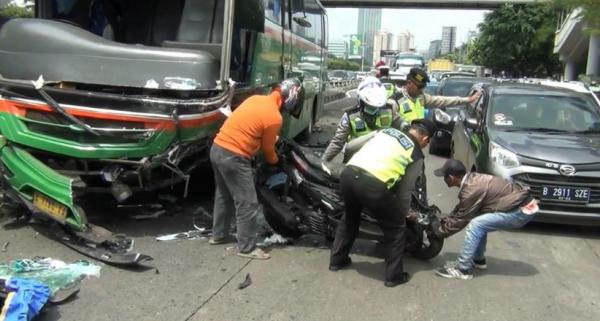 Sejumlah mobil ringsek setelah dihantam bus. Bahkan, satu motor terjebak masuk kolong bus dan mengalami rusak parah.