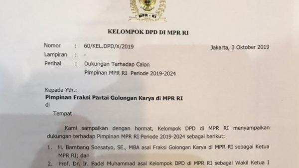 Surat nomor: 60/KEL.DPD/X/2019 tertanggal 3 Oktober 2019 tersebut memuat dua poin. Pertama, mendukung Bamsoet sebagai ketua MPR dan poin kedua mendukung Fadel Muhammad perwakilan dari unsur DPD sebagai wakil ketua I MPR.