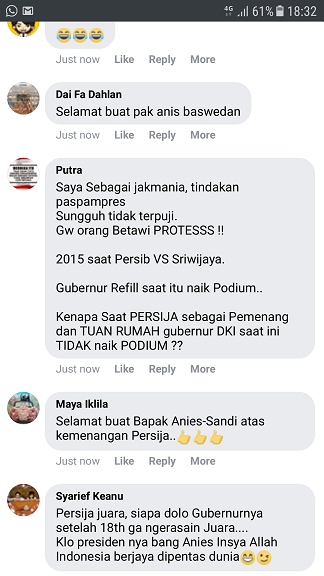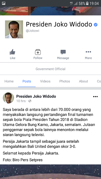 JAKARTA, iNews.id – Kemenangan yang diraih Persatuan Sepak Bola Indonesia Jakarta (Persija) dalam ajang Piala Presiden 2018, memberi kesan sendiri di kalangan warganet. Beberapa jam lalu, akun Facebook resmi milik Presiden Joko Widodo (terverifikasi) mengunggah ucapan selamat atas kemenangan tim berjuluk “Macan Kemayoran” itu.