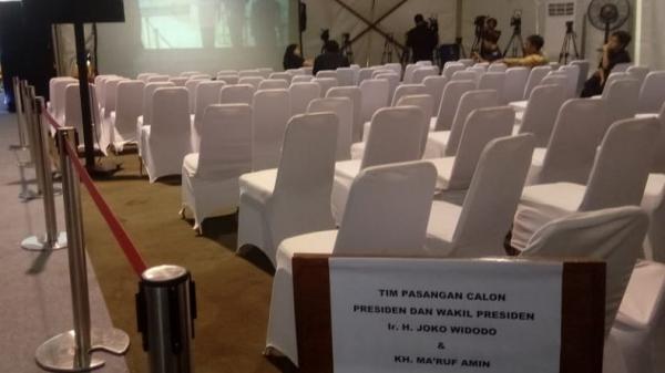 Di dalam gedung yang menjadi tempat pengundian nomor urut, barisan kursi telah dipasangi garis pembatas. Satu sisi untuk pasangan Joko Widodo-Ma’ruf Amin dan pendukungnya, sementara di barisan lain untuk pasangan Prabowo Subianto-Sandiaga Uno dan pendukungnya.