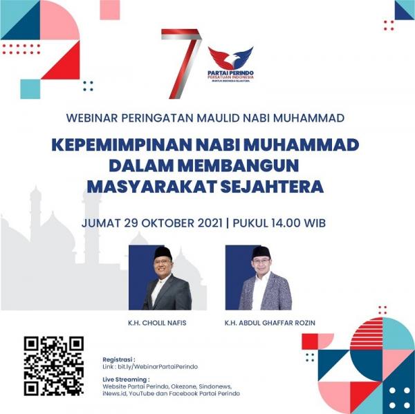 Webinar yang akan dihadiri ribuan peserta itu membahas sejumlah topik keteladanan dan kepemimpinan Nabi Muhammad SAW dalam membangun kehidupan umat manusia. Peserta dapat menyaksikan melalui Zoom dengan link registrasi: bit.ly/WebinarPartaiPerindo.