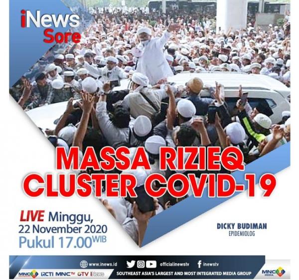 Dugaan kerumunan massa HRS akan menjadi tema utama iNews Sore hari ini dengan menghadirkan narasumber dari Satgas Penanganan Covid-19, dengan tema “Massa Rizieq Cluster Covid-19.”