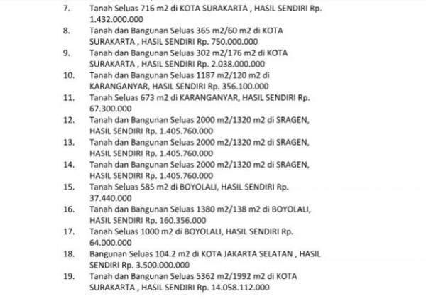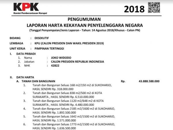 Dikutip dari salinan LHKPN, Jokowi menyampaikan harta kekayaannya pada 14 Agustus 2018. Harta Jokowi terdiri atas harta tidak bergerak senilai Rp43,88 miliar yang terdiri atas 20 tanah dan bangunan di Sukoharjo, Surakarta, Boyolali, Sragen, dan Jakarta Selatan.