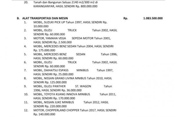Selain itu, 12 unit alat transportasi terdiri atas 10 mobil dan dua motor senilai Rp1,083 miliar. Menariknya, di antara alat transportasi ini terdapat motor Chopper Chopperland warna emas yang dibeli dari bengkel modifikasi Elder Garage. Motor warna emas itu bernilai Rp140 juta.