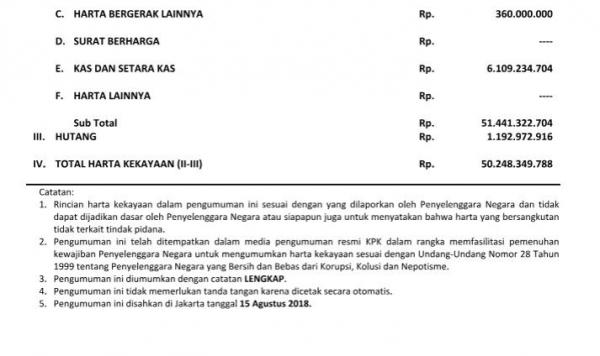 JAKARTA, iNews.id - Komisi Pemberantasan Korupsi (KPK) merilis harta kekayaan bakal calon presiden Joko Widodo. Berdasarkan laporan hasil kekayaan penyelenggaran negara (LHKPN), jumlah harta Jokowi mencapai Rp50,2 miliar. Persisnya, Rp50.248.349.788.