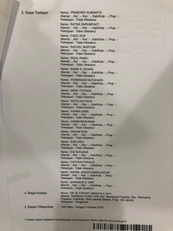 Adapun 17 politisi yang turut dilaporkan Farhat ke polisi adalah Amien Rais, Ratna Sarumpaet, Fadli Zon, Rachel Maryam, Rizal Ramli, dan Nanik Deyang. Berikutnya, ada nama Ferdinand Hutahaean, Arief Poyuono, Natalius Pigai, Fahira Idris, Habiburokhman, Hanum Rais, Said Didu, Eggy Sudjana, Captain Firdaus, Dahnil Azar Simanjuntak, dan Sandiaga Salahuddin Uno.
