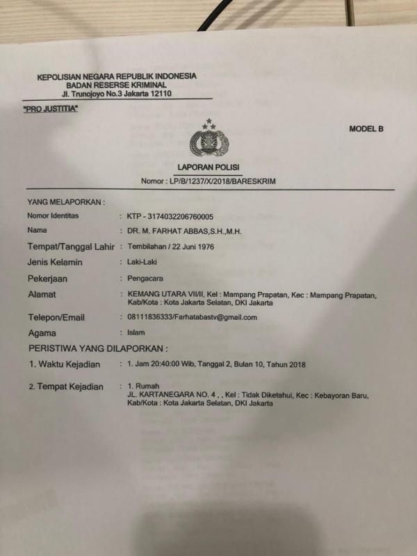 Karena beredarnya informasi palsu itulah, Farhat membuat laporan ke polisi. Saat ini, laporan bernomor LP/B/1237/X/2018/BARESKRIM itu sudah diterima polisi dengan nomor register STTL/1007/X/2018/BARESKRIM. “Yang kami laporkan berkaitan dengan konspirasi dan permufakatan jahat, fitnah Ratna Sarumapet dirinya seolah-olah dizolimin,” kata mantan suami artis Nia Daniaty itu.