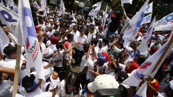 Ketua Umum Partai Perindo Hary Tanoesoedibjo (HT) menyapa massa pendukung usai meraih tiga rekor dunia MURI untuk program-program membantu masyarakat yang terbesar di Indonesia, di Merdeka Barat, Jakarta, Sabtu (13/4/2019). (Foto: IST)
