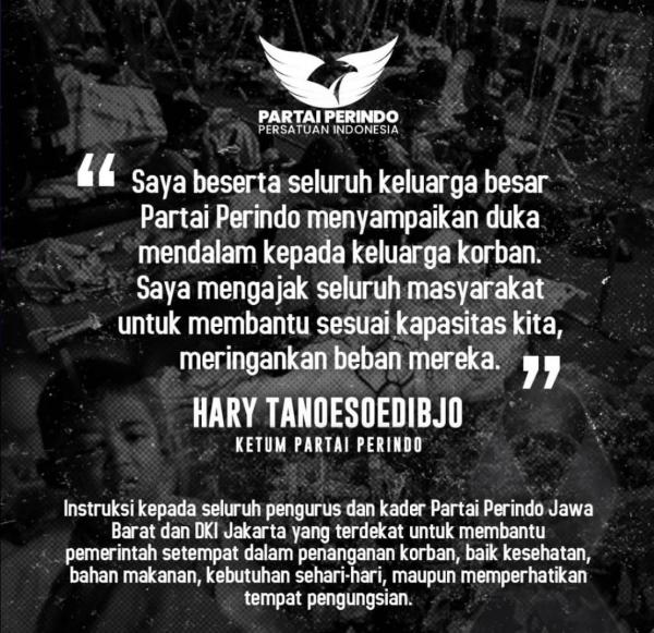 “Saya instruksikan kepada seluruh pengurus dan kader Partai Perindo Jawa Barat dan DKI Jakarta yang terdekat untuk membantu pemerintah setempat dalam penanganan korban, baik kesehatan, bahan makanan, kebutuhan sehari-hari, maupun memperhatikan tempat pengungsian,” ujar Hary.