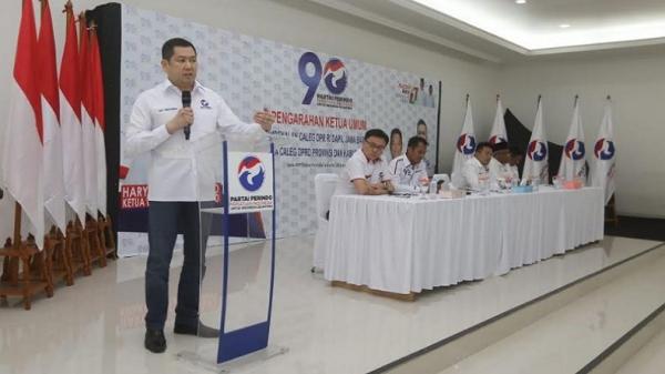 HT berbicara di depan para calon anggota legislatif (caleg) DPR, DPRD provinsi dan DPRD kabupaten/kota Dapil Jawa Barat VI dan VII di Kantor DPP Partai Perindo, Menteng, Jakarta.
