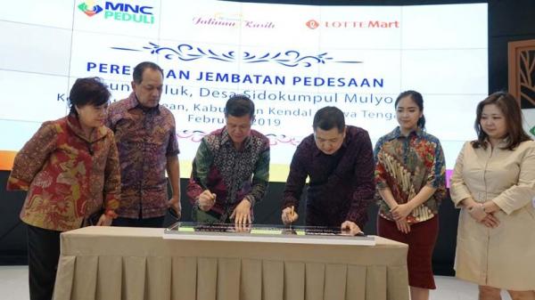 JAKARTA, iNews.id - Chairman MNC Group Hary Tanoesoedibjo (HT) menandatangani prasasti Jembatan Dusun Cipluk, Kecamatan Patean, Kendal, Jawa Tengah di iNews Center, Jakarta, Jumat (1/2/2019). Penandatanganan prasasti menandai rampungnya pembangunan jembatan sepanjang 134 meter tersebut.
