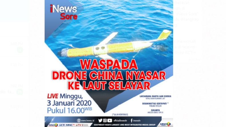"iNews Sore" Live di iNews dan RCTI+ Minggu Pukul 16.00: Waspada Drone China Nyasar Ke Laut Selayar