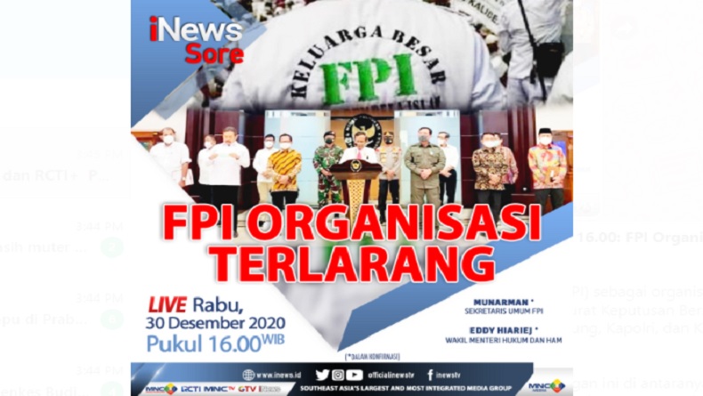 "iNews Sore" Live di iNews dan RCTI+ Pukul 16.00: FPI Organisasi Terlarang