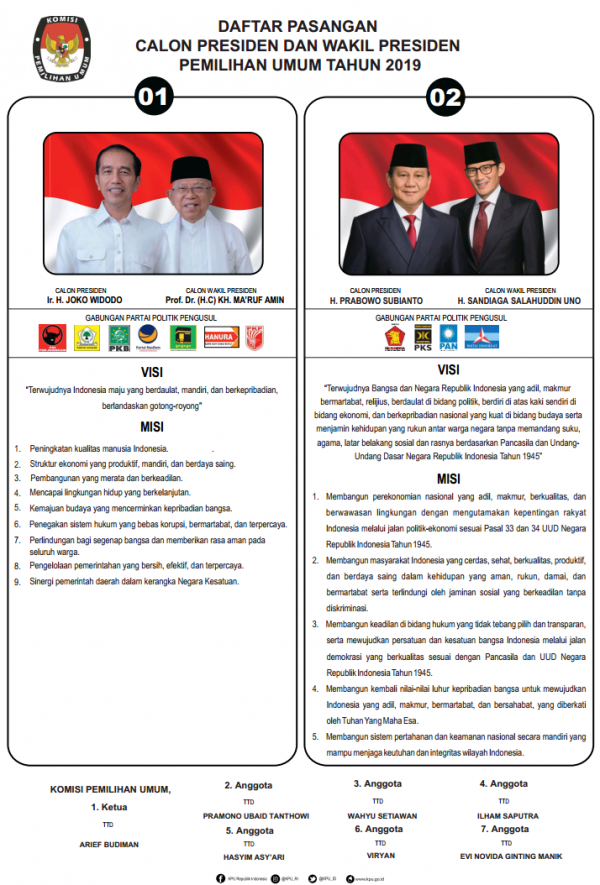 Visi dan misi para kandidat RI 1 dan RI 2 itu pun telah didaftarkan oleh masing-masing pasangan calon ke Komisi Pemilihan Umum (KPU) pada Sabtu (22/9/2018) lalu sebagai salah satu persyaratan untuk mengikuti kompetisi Pilpres 2019. Pasangan capres-cawapres nomor urut 01 Jokowi–Ma’ruf mengusung visi “Terwujudnya Indonesia maju yang berdaulat, mandiri, dan berkepribadian berlandaskan gotong royong”.