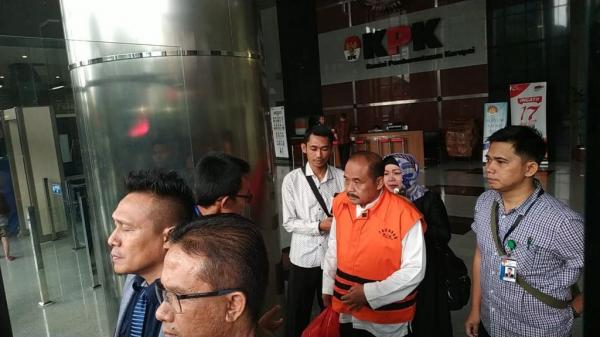 Kepala Dinas Pendidikan Kabupaten Cianjur, Cecep Sobandi (mengenakan rompi tahanan orange), ditahan petugas KPK. (Foto: iNews.id/Ilma De Sabrini)