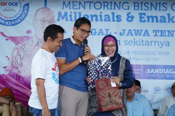Ratusan peserta yang mulai merintis usaha di Tegal tampak antusias menyambut Sandi saat tiba di Rumah Makan Dji- Toe. Mengenakan baju biru dan celana krem, mantan wakil gubernur DKI Jakarta itu langsung diserbu dengan ajakan swafoto atau jabat tangan. Sandi juga berdialog dengan para pemilik stan UMKM yang menjajakan produk busana hingga kuliner di Tegal.