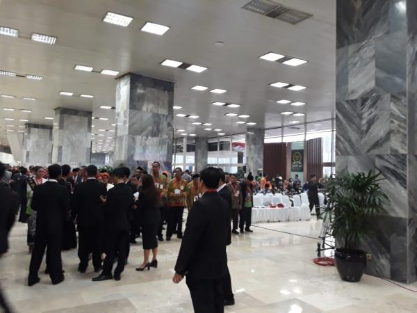Terlihat di dalam Gedung Nusantara juga sudah mulai ramai diisi peserta dan juga awak media. Banyak peserta tampak mengenakan setelan jas dan juga batik.