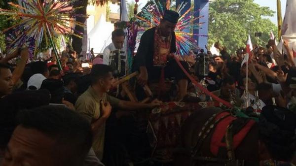 TANGERANG, iNews.id - Capres Cawapres Joko Widodo (Jokowi)-Ma'ruf Amin menghadiri Pawai Karnaval Bersatu di Tangerang, Minggu (7/4/2019). Pasangan calon (paslon) nomor urut 01 itu tiba di lokasi menumpangi delman.