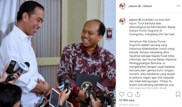 Rasa kehilangan dan dukacita itu disampaikan Jokowi melalui akun media sosial. ”Innalillahi wa inna ilaihi rajiun. Turut berduka atas berpulangnya ke Rahmatullah, Bapak Sutopo Purwo Nugroho di Guangzhou, menjelang dini hari tadi,” kata Jokowi di akun Instagram, Minggu (7/7/2019).