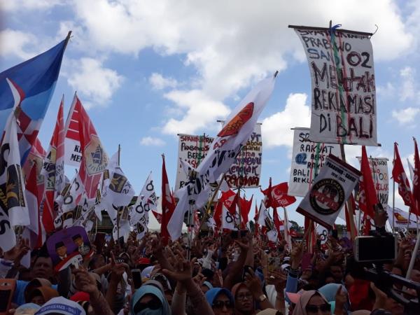 DENPASAR, iNews.id – Calon Presiden Prabowo Subianto melanjutkan kampanye terbuka dengan menyapa masyarakat Bali, Selasa (26/3/2019). Saat berorasi di hadapan ribuan pendukungya di Pulau Dewata itu, Prabowo melihat beberapa spanduk yang ditulis tangan dari karung beras.
