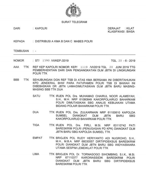 Mutasi dan rotasi jabatan 86 perwira Polri tertuang dalam Surat Telegram Kapolri Nomor ST/1590/VI/KEP/2019 dan Surat Telegram Kapolri Nomor ST/1591/VI/KEP/2019 tertanggal 20 Mei 2019 tentang Pemberhentian dari dan Pengangkatan dalam Jabatan di Lingkungan Polri.