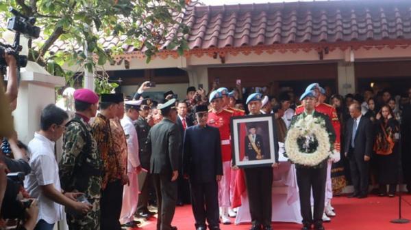 JAKARTA, iNews.id - Upacara penyerahan jenazah almarhum Presiden ketiga Indonesia Bacharuddin Jusuf (BJ) Habibie dari keluarga kepada negara dilaksanakan di rumah duka, Jalan Patra Kuningan, Jakarta, Kamis (12/9/2019). Upacara dipimpin oleh Ketua Mahkamah Konstitusi (MK) Anwar Usman.
