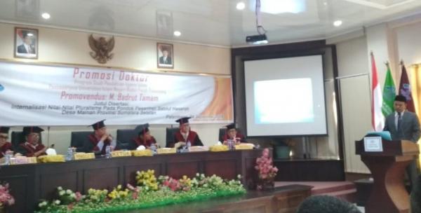 Badrut Tamam dalam sidang terbuka untuk meraih gelar doktor di UIN Raden Fatah Palembang.