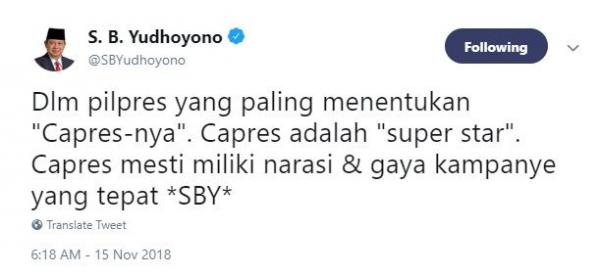 ”Dlm pilpres yang paling menentukan "Capres-nya". Capres adalah "super star". Capres mesti miliki narasi & gaya kampanye yang tepat *SBY*,” kata SBY.