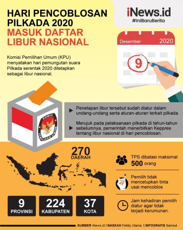 JAKARTA, iNews.id - Komisi Pemilihan Umum (KPU) menyatakan hari pemungutan suara Pilkada serentak 2020 yang jatuh pada tanggal 9 Desember 2020 ditetapkan sebagai libur nasional. Hal tersebut bertujuan untuk meningkatkan partisipasi pemilih.