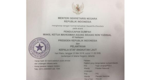 Berdasarkan surat undangan dari Sekretariat Negara, Laksdya Siwi akan menjalani upacara pelantikan dan pengambilan sumpah jabatan pada pukul 11.00 WIB.