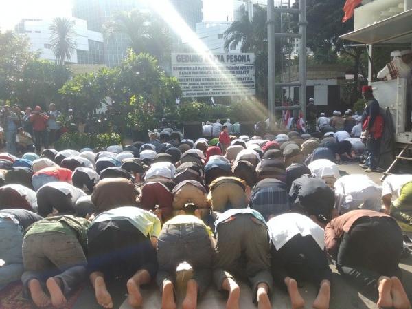 Beralaskan tikar dan koran, massa demonstran mulai melaksanakan salat berjamaah. Mereka menunaikan ibadah dengan khusyuk mengikuti imam.