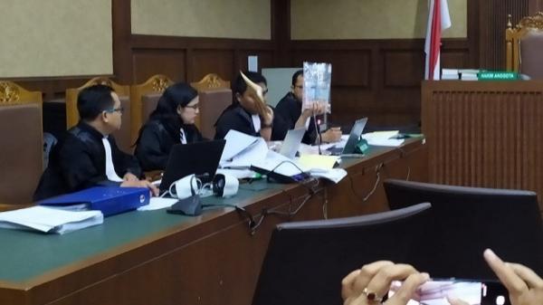 Jaksa KPK menunjukkan uang dalam amplop coklat kepada Menag Lukman Hakim di persidangan Tipikor, Jakarta, Rabu (26/6/2019).