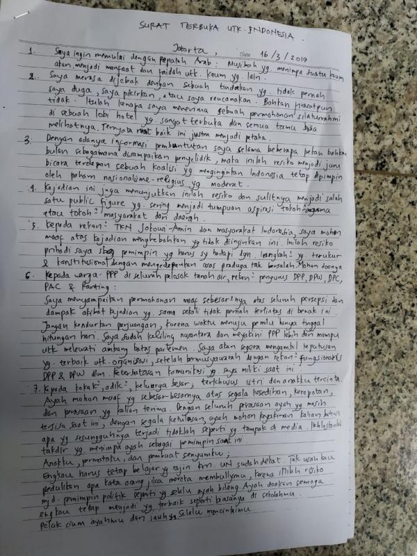 6. Kepada warga PPP di seluruh pelosok Tanah Air; rekan-rekan pengurus DPP DPW, DPC, PAC dan Ranting. Saya menyampaikan permohonan maaf sebesar-besarnya atas seluruh persepsi dan dampak akibat kejadian yang sama sekali tidak pernah terlintas di benak ini. Jangan kendurkan perjuangan karena waktu menuju pemilu hanya tinggal hitungan hari. Saya sudah keliling nusantara dan meyakini PPP lebih dan mampu untuk melewati ambang batas parlemen. Saya akan segera mengambil keputusan yang terbaik untuk organisasi, setelah bermusyawarah dengan rekan-rekan fungsionaris DPP dan DPW dalam keterbatasan komunikasi yang saya miliki saat ini.