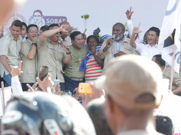 “Mengapa saya memulai kampanye dari ujung timur? Karena matahari terbit dari timur. Terima kasih atas dukungannya. John Gluba Gebze adalah sahabat saya. Beliau adalah pejuang, patriot, dan setia kepada NKRI. Karena itu, saya berikan baju saya ini sebagai tanda penghormatan saya kepada sahabat saya,” ujar Prabowo sembari melepas kemejanya.