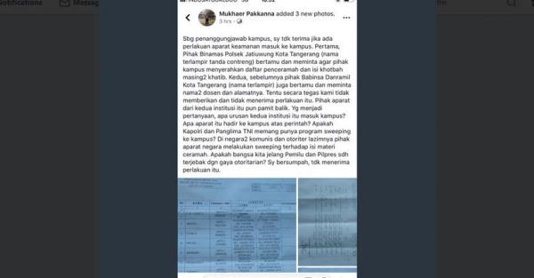 Sebelumnya beredar di media sosial Mukhaer Pakkanna yang mengaku sebagai penaggung jawab kampus di salah satu perguruan tinggi. Dia mengungkapkan, pihak Binamas Polsek Jatiuwung Kota Tangerang datang dan meminta agar pihak kampus menyerahkan daftar penceramah dan isi khutbah masing-masing khatib.