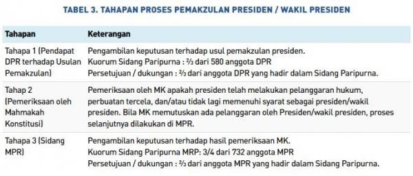Syarat, proses dan mekanisme pemakzulan presiden/wakil presiden selanjutnya diatur dalam pasal 7A dan 7B UUD 1945 hasil amandemen. Pada pasal 7A disebutkan bahwa: "Presiden dan/atau Wakil Presiden dapat diberhentikan dalam masa jabatannya oleh Majelis Permusyawaratan Rakyat atas usul Dewan Perwakilan Rakyat, baik apabila terbukti telah melakukan pelanggaran hukum berupa pengkhianatan terhadap negara, korupsi, penyuapan, tindak pidana berat lainnya, atau perbuatan tercela maupun apabila terbukti tidak lagi memenuhi syarat sebagai Presiden dan/atau Wakil Presiden."