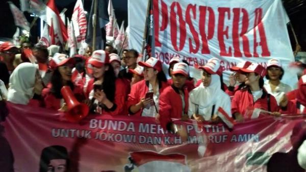 Pantauan iNews.id, pendukung pasangan Jokowi-Ma'ruf ini memakai pakaian yang didominasi berwarna merah dan putih. Jumlah kelompok relawan dan simpatisan ini mencapai ratusan orang.