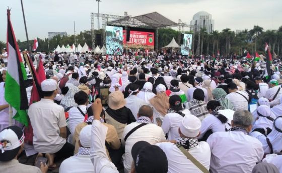 JAKARTA, iNews.id - Aksi Bela Palestina digelar di Jakarta, Minggu (5/11/2023). Ratusan bahkan jutaan orang dari berbagai daerah dan kelompok berdatangan sejak subuh untuk mengikuti acara yang dipusatkan di Monumen Nasional (Monas).