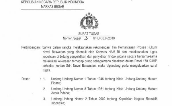Pembentukan tim gabungan tertuang dalam Surat Tugas Kapolri Nomor Sgas/3/I/HUK.6.6/2019. Tim gabungan ini untuk menindaklanjuti rekomendasi tim pemantauan proses hukum terhadap Novel yang dibentuk Komnas HAM sekaligus melaksanakan tugas kepolisian di bidang penyelidikan dan penyidikan.