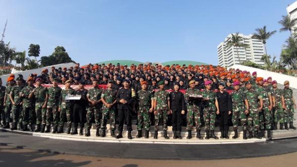 Setelah acara pemotongan tumpeng, jajaran TNI dan Polri yang berada di gedung DPR juga melakukan foto bersama di tangga gedung kura-kura.